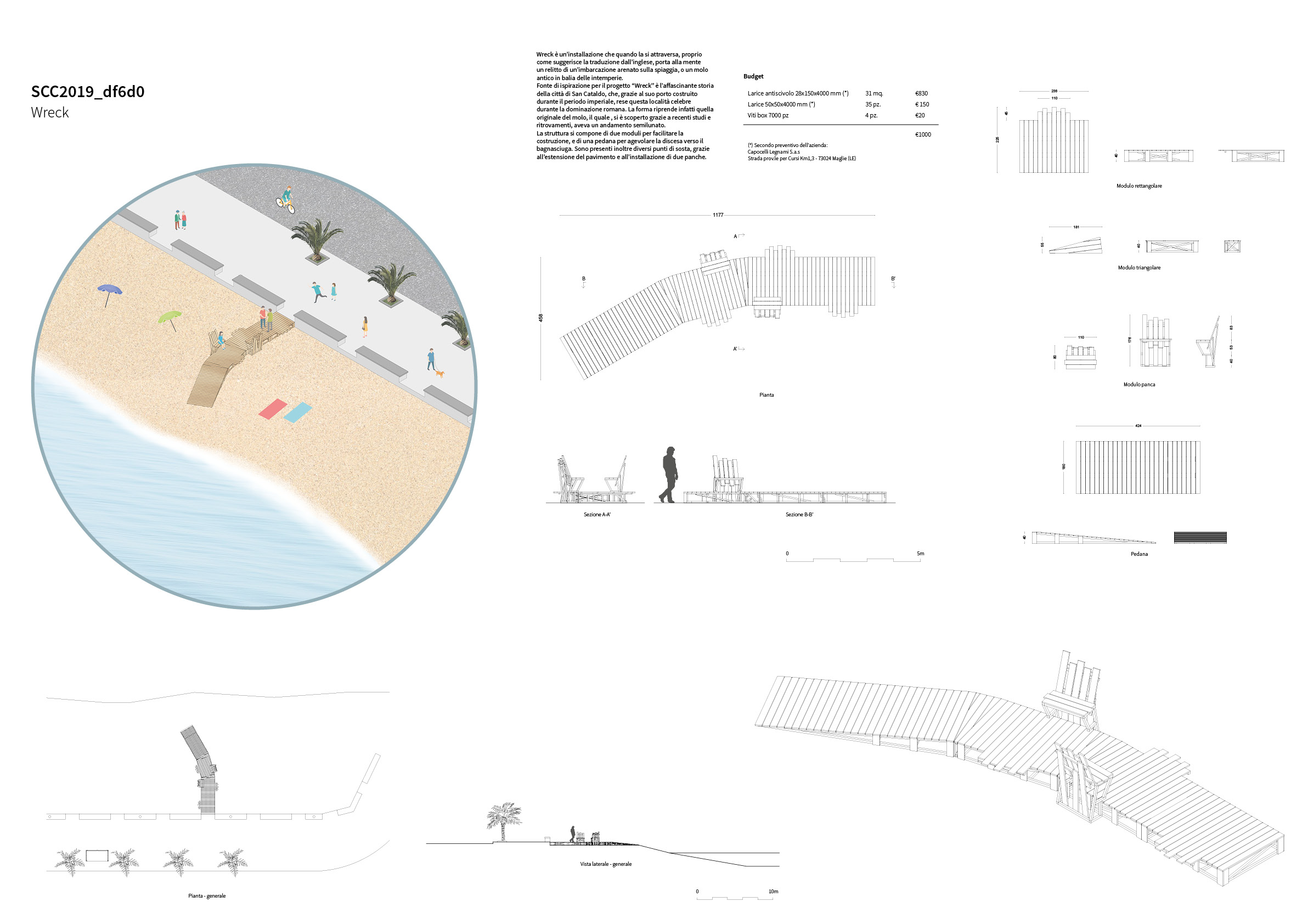 Fonte di ispirazione per il progetto “Wreck” è l’affascinante storia della città di San Cataldo, che, grazie al suo porto costruito durante il periodo imperiale, rese questa località celebre durante la dominazione romana. La forma riprende infatti quella originale del molo, il quale , si è scoperto grazie a recenti studi e ritrovamenti, aveva un andamento semilunato. La struttura si compone di due moduli per facilitare la costruzione, e di una pedana per agevolare la discesa verso il bagnasciuga. Sono presenti inoltre diversi punti di sosta, grazie all’estensione del pavimento e all’installazione di due panche.