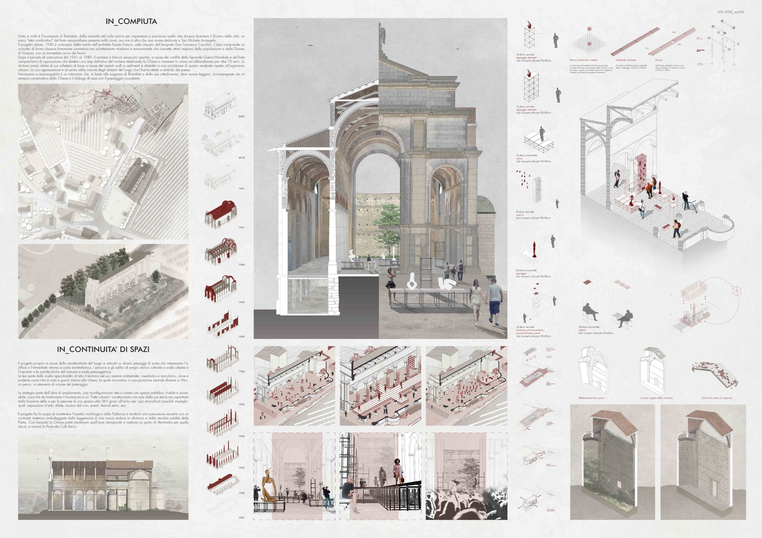 La strategia parte dall’idea di ampliamento, una riconfigurazione atta a creare uno spazio pubblico, fruibile e accessibile, cosicché da trasformare L’Incompiuta in un “Fatto urbano” caratterizzato non solo dalla sua storia ma soprattutto dalla fruizione delle e per le persone di uno spazio utile 365 giorni all’anno per i più diversificati possibili impieghi, quali: esposizioni d’arte, sfilate, musica dal vivo, eventi, festival estivi, ecc. Il progetto ha lo scopo di mantenere l’aspetto morfologico della Fabbrica e renderla una costruzione versatile con un contrasto materico simboleggiato dalla leggerezza di una nuova struttura in alluminio e dalla vecchia solidità della Pietra. Così facendo la Chiesa potrà mantenere quell’aura atemporale e restituire un punto di riferimento per quella che è, e rimarrà la Porta dei Colli Berici.