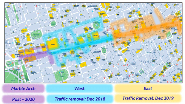 Con una stima di 500.000 pedoni che lo percorrono ogni giorno, oggi Oxford Street è una delle arterie commerciali più trafficate d’Europa. Attualmente i pedoni condividono lo spazio con due corsie di traffico, il che significa che i turisti, i residenti e i lavoratori devono combattere con una serie sterminata di taxi, risciò, autobus e biciclette. In questa nuova proposta, la strada sarebbe stata portata allo stesso livello del marciapiede (rendendolo più accessibile per i disabili), gli autobus sarebbero reinstradati su altri percorsi e gli stalli per i taxi aumentati; per chi va in bici, c’è una promessa per una consultazione separata (che si terrà in estate) per realizzare nuovi percorsi ciclabili lungo strade parallele più tranquille su entrambi i lati di Oxford Street. Con questo tipo di configurazione, la strada sarebbe in grado di ospitare una sequenza di piazze pubbliche (fiancheggiate da alberi e panchine) e il traffico continuerebbe a correre da nord a sud attraverso la strada in determinati punti. Un’opera d’arte pubblica di 800 metri potrebbe essere commissionata per progettare il nuovo spazio.