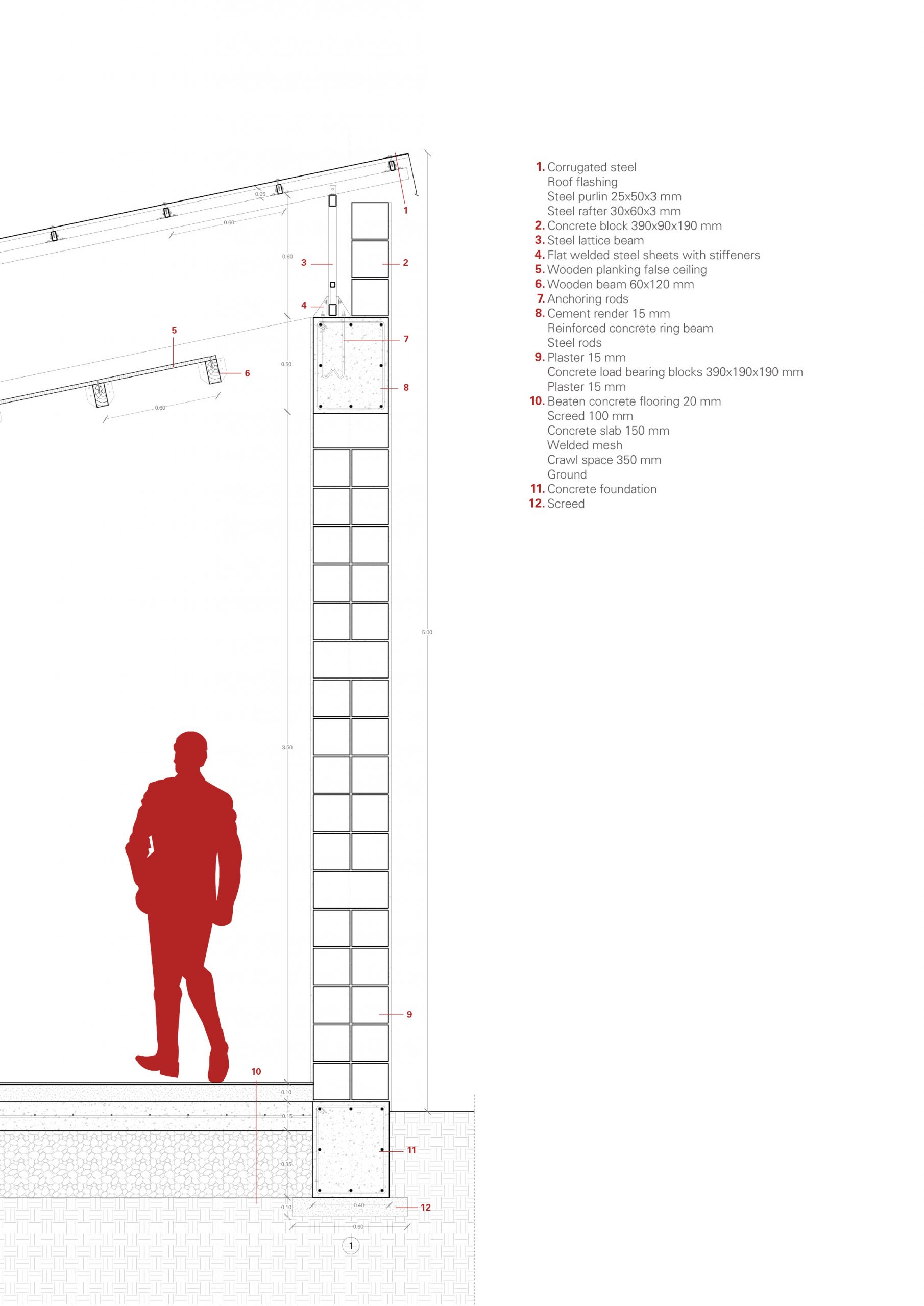 The result is an introverted architecture, whose solid exterior appearance is reversed by the town square inside. It is defined by a clean but a heterogeneous perimeter, articulated by solid wall, permeable wall and void. The entrances to the square comply both a rhythm self-imposed and the construction placed on the limits area and divides the building in three internal blocks: the Police Station’s, the Town Hall and the public Town Hall Meeting. The double skin ventilated roof guarantees a constant ventilation in interior spaces. Thanks to about 1.100 m2 of roof, the project can collect more than 1.200 m3 of clean rainwater every year to distribute to the people, in a place without public water supply, and when although it is surrounded by one of the larger water reserves on the planet, it is heavily polluted, so unsuitable for human consumption. The structure is made by structural steel and concrete load bearing block. According to sustainability principles, concrete can be produced by various cement factories in the region. This provides support and promotes local economic development and reduces spread of pollution and costs of transport. Materials durability allows for environmental impact mitigation of its production. The cost of materials for the project is nearly € 170.000. The estimation was made by consulting with some companies present in the region and thanks to the support of the thesis’ partners working in the area, so they know the local economy.