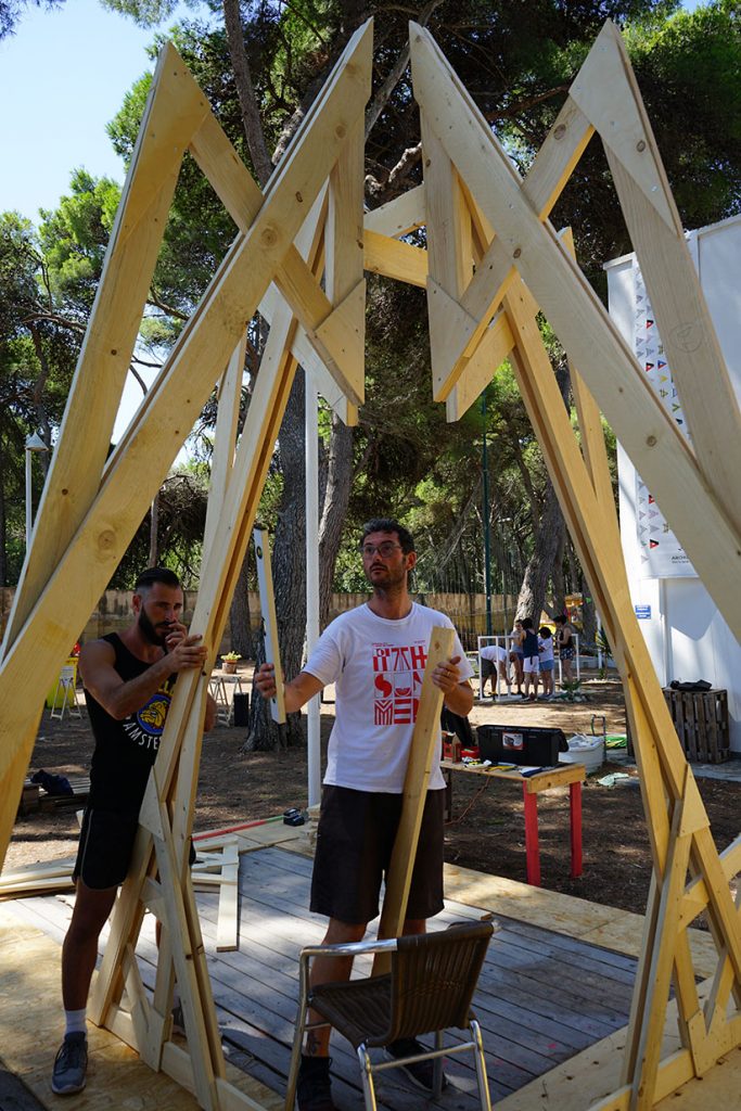 Lumia è stato realizzato durante un laboratorio di autocostruzione in cui, a partire da un singolo elemento costruttivo ripetuto, si è configurata l’installazione.