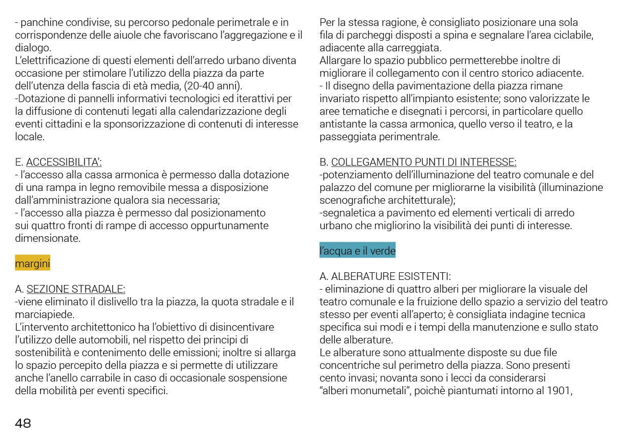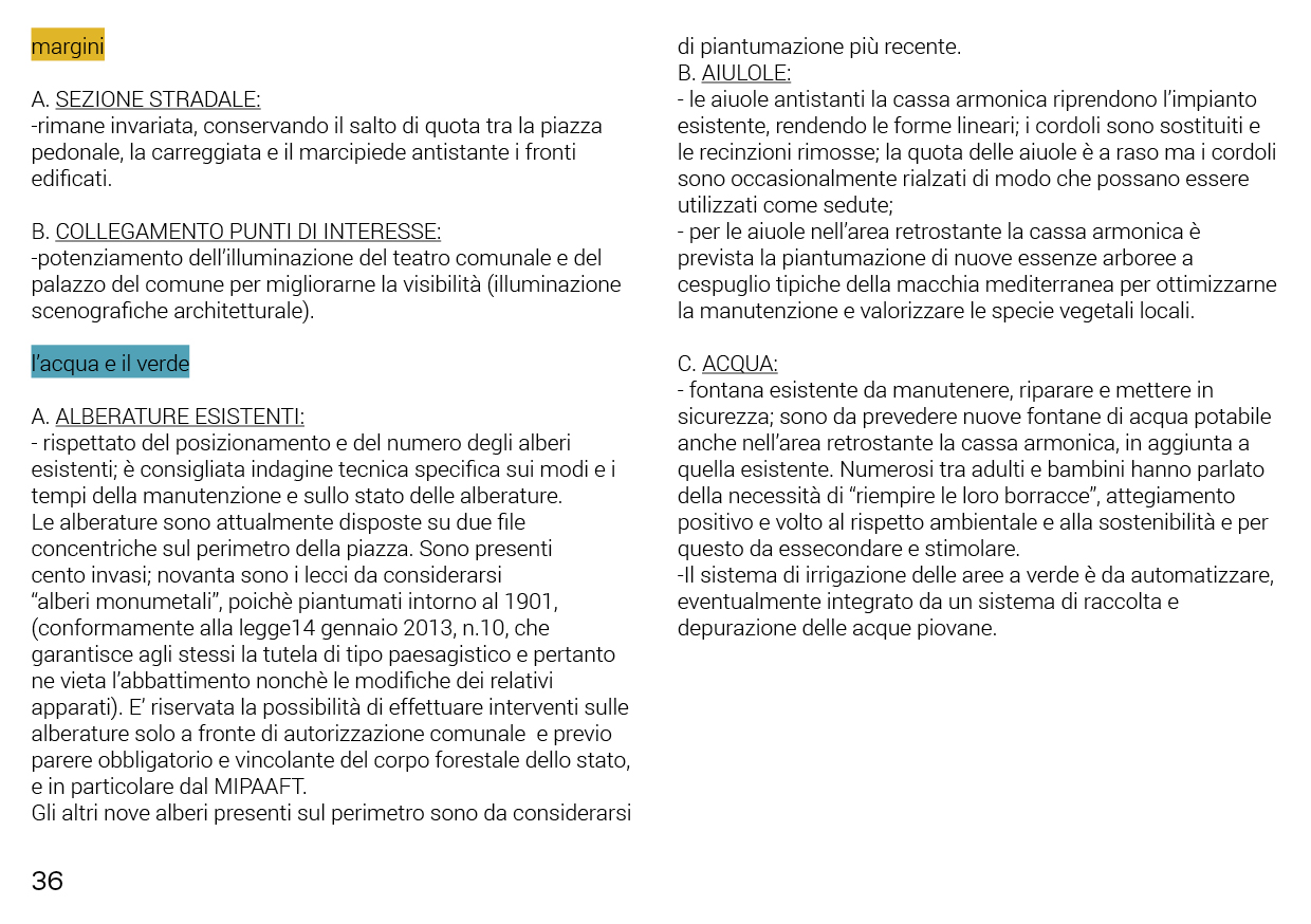 The participatory process was divided into two phases. The first phase involved the community; the citizens looked at the project proposals, outlined suggestions on graphic material prepared by the facilitators, and viewed examples and project references in response to the project themes identified by the administration. The laboratory was divided into three working tables with specific focuses: uses – in order to identify all possible uses of the square and evaluate new possible functions of the public space; margins – in order to rethink the margins of the square and the relationship of the public space with the functions and the pre-existing areas in the square; water and green – in order to assess the present and future structure of green and water in the square.