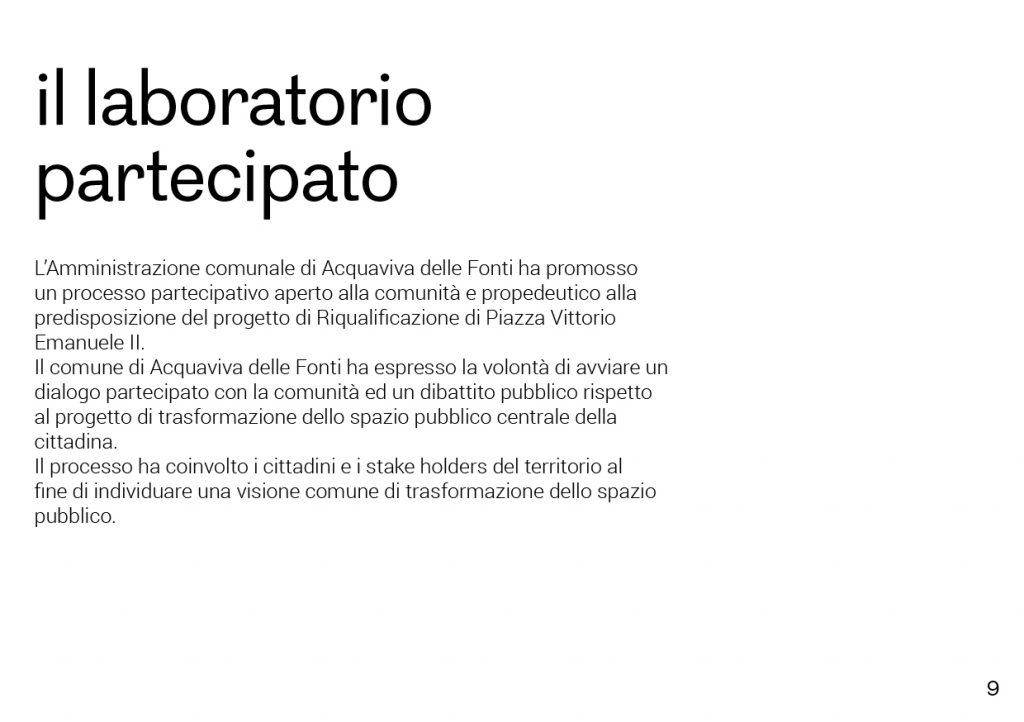 L’Amministrazione comunale di Acquaviva delle Fonti ed Archistart, con la partecipazione di Biro+, hanno promosso un processo partecipativo aperto alla comunità e propedeutico alla predisposizione del progetto di Riqualificazione di Piazza Vittorio Emanuele II. Il comune di Acquaviva delle Fonti ha espresso la volontà di avviare un dialogo partecipato con la comunità ed un dibattito pubblico rispetto al progetto di trasformazione dello spazio pubblico centrale della cittadina.